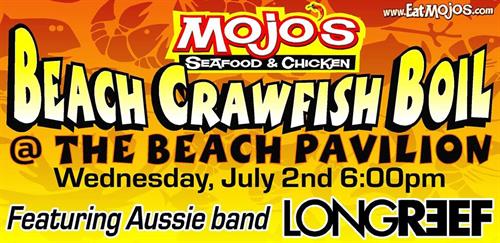 Mojo's Seafood & Chicken brings you the Beach Crawfish Boil and Concert at the Gulf State Park Beach Pavilion on Wednesday, July 2nd at 6:00pm. Tickets are $15 beforehand and $20 at the gate and are good for a delicious crawfish platter and live entertainment by Aussie band Longreef! You can get your tickets by stopping by Mojo's on 59 (in front of Zoo) or by calling (251) 591-5055.