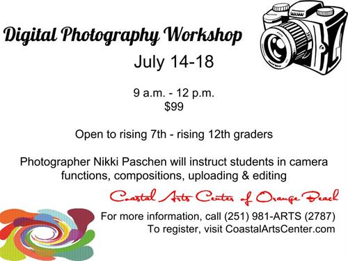 The Coastal Arts Center of Orange Beach will hold a Digital Photography Workshop for rising seventh through rising twelfth graders July 14 through 18 from 9 a.m. till noon. Photographer Nikki Paschen will instruct students in the areas of camera function, composition and editing.
