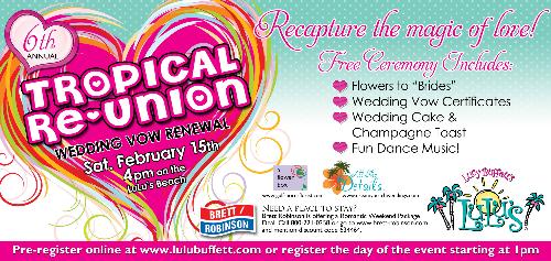 Recapture the magic of LOVE at LuLu's 6th Annual Tropical Re-Union Wedding Vow Renewal! This free event is sure to put the romance back in your life. Let LuLu's handle all the details! Come renew your vows along side of hundreds of other couples! Complimentary wedding cake, champagne toast, certificate of renewal, and flowers for the "brides".