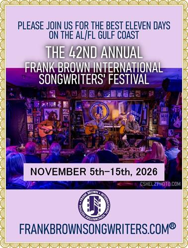 The 42nd annual Frank Brown International Songwriters’ Festival will feature more than 200 nationally acclaimed songwriters in venues along the Florida / Alabama Gulf Coast from November 5th - 15th, 2026. The festival is an opportunity for seasoned and aspiring songwriters and musicians from all over the world to have their songs heard, and for the public to learn the stories behind the lyrics that only the song’s author can express. During this exciting eleven day festival, performers will be hosted in over two dozen venues along the FL/AL Gulf Coast.